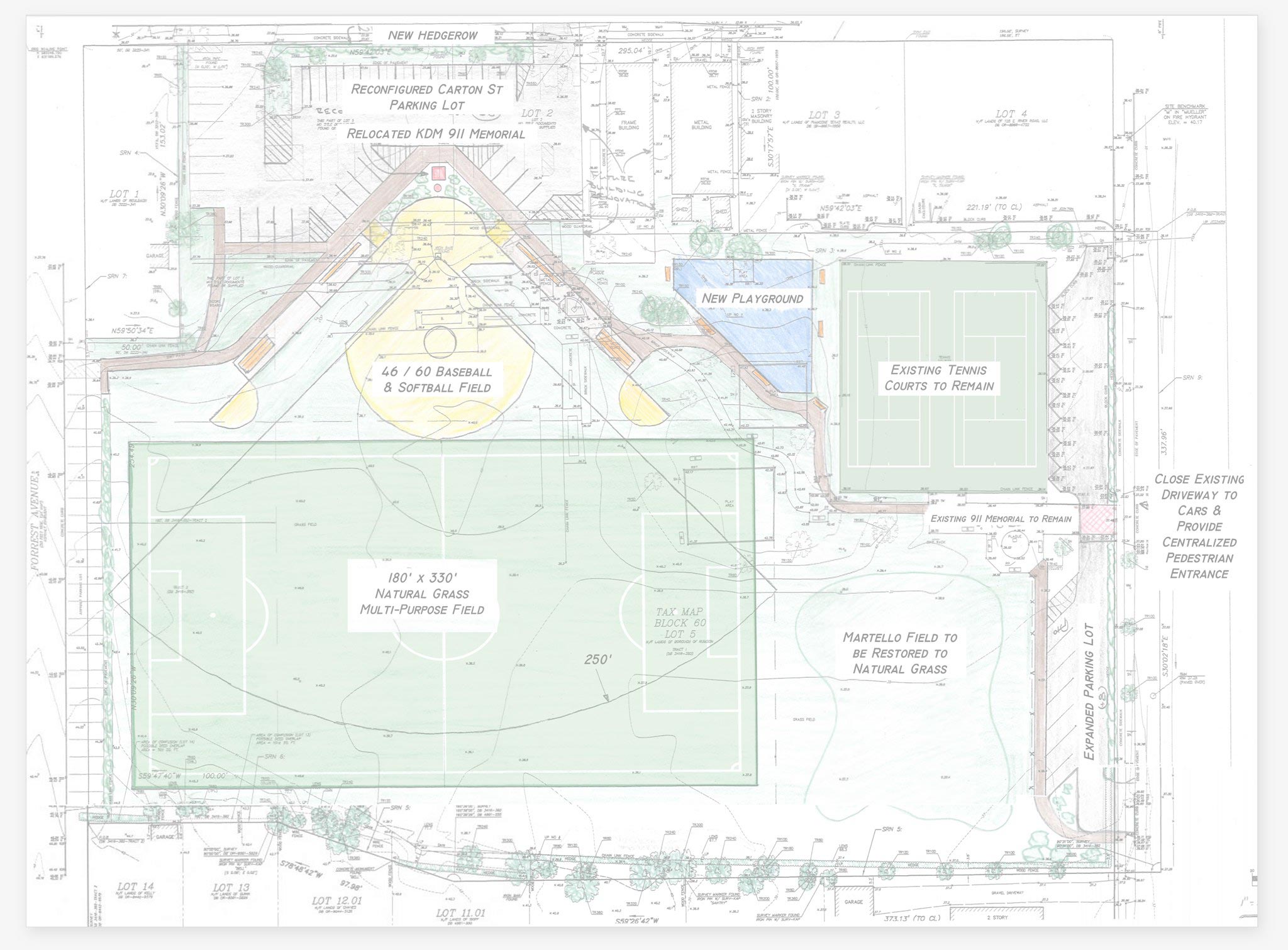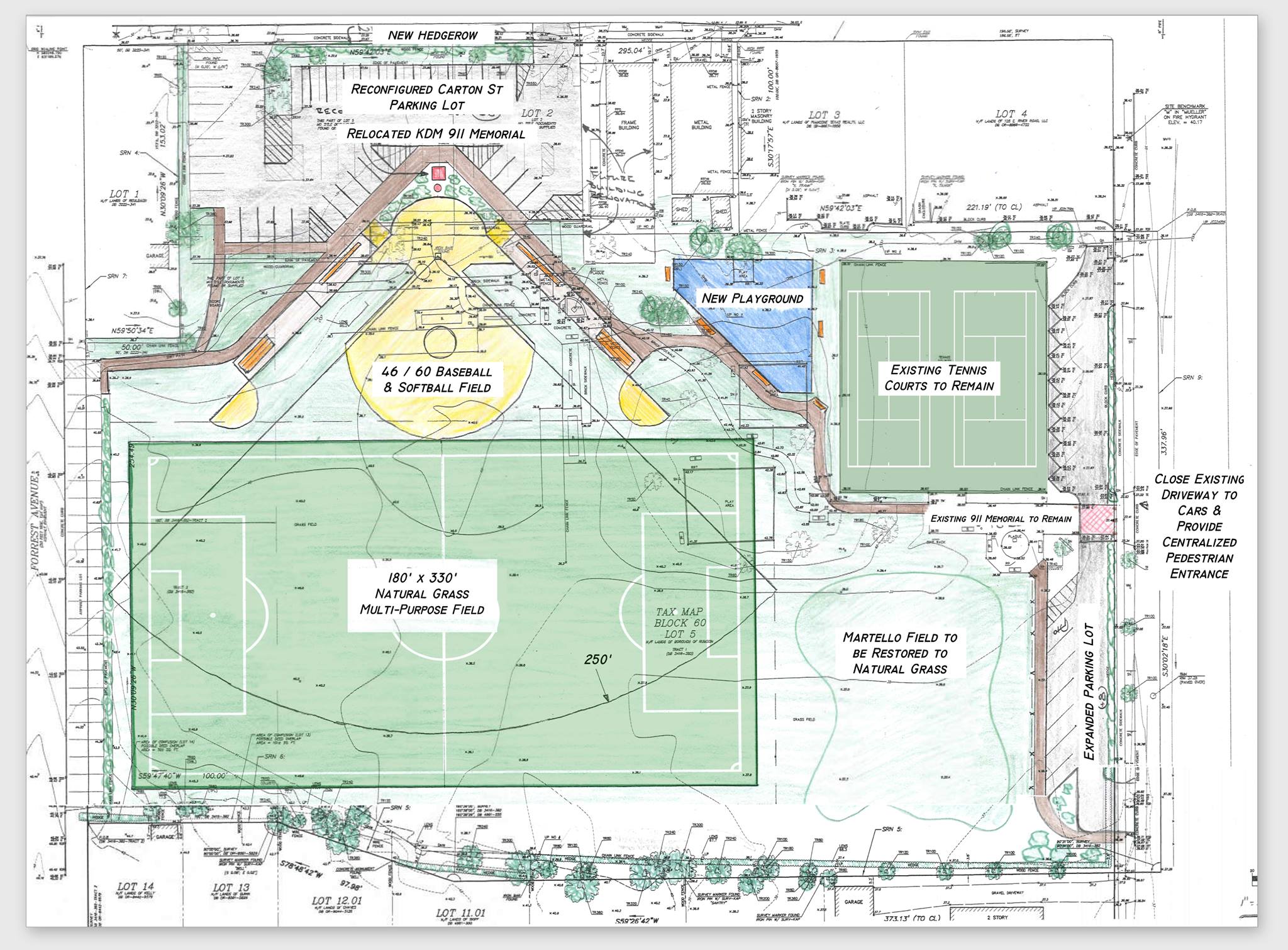 The existing tennis courts will remain where they are, and the existing 9/11 Memorial near East River Road will remain in its current location. The KDM 911 Memorial will be relocated to align with the new baseball/softball field and will be prominently featured as you enter Piping Rock Park from Carton Street. While construction is underway, the memorial will be stored in the Department of Public Works building. A new playground will be installed on the west side of the tennis courts, just north of the current playground.