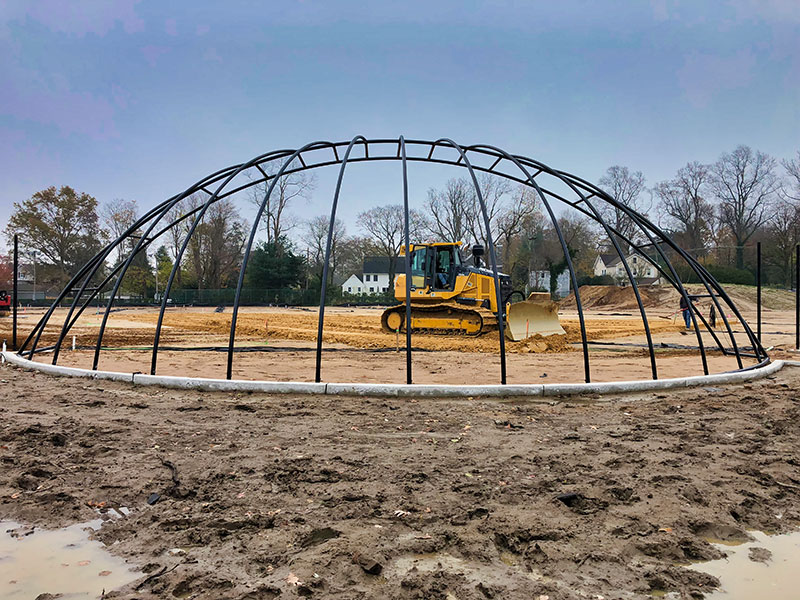 Even with inclement weather work at Piping Rock Park has continued forward! The on-site drainage installation is complete and most of the irrigation system has been installed. The arched backstop has been set and the concrete for the team player and spectator areas has been poured.