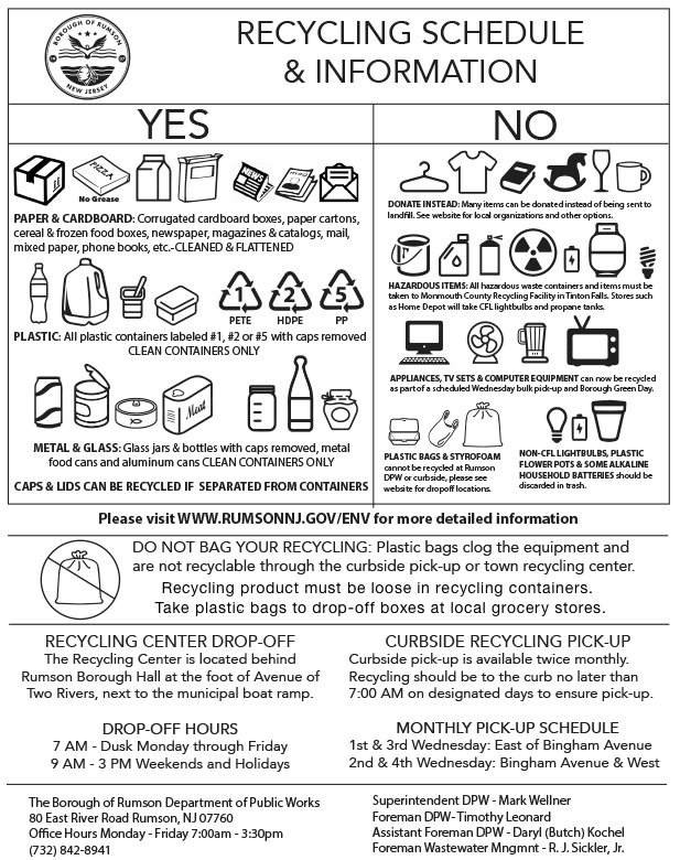 Thanks to the residents of Rumson, we have one the highest recycling rates in Monmouth County and the State of New Jersey. This is not only great from a "green" standpoint, but it saves the taxpayers money every year in landfill fees. That's really good news! Recycling may be taken to the drop-off center or picked up at the curb.