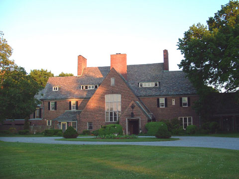 When completed in early 1918*, the 200-foot long mansion held 27 rooms with 10 tiled bathrooms. The English Tudor style was similar to many of the great houses in England. Heavy slate pieces some weighing more than 175 pounds were imported from Wales along with the skilled workers to put them into place on the steeply pitched roof. This type of roof was so much a Lindeberg trademark that the style came to be known as a "Lindeberg roof." The peak of the house reaches 56 feet making what is now Sheep's Run one of the tallest houses in Rumson. The style of slate placement was called "drunken shakes" for its seemingly haphazard arrangement. The roof is said to have a life expectancy of 300 years and hasn't yet reached the point of being one third of the way through its effective life.